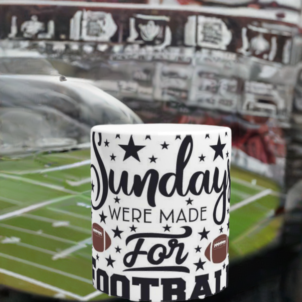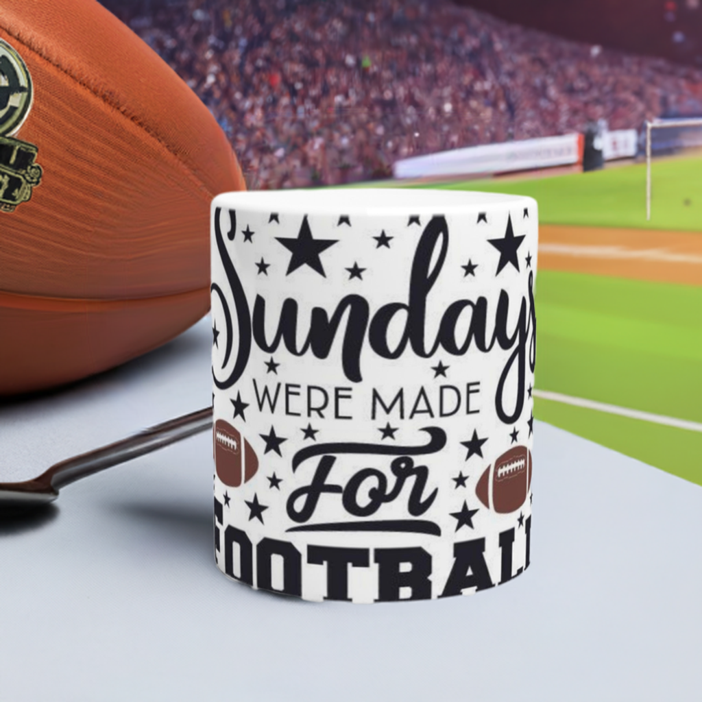 Get ready to kick off your Sundays with this ceramic mug that declares, "Sundays were made for Football"! The perfect companion for your morning coffee, this mug will get you ready to cheer on your favorite team in style.